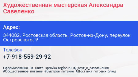 Художественная мастерская Александра Савеленко по адресу 344082, Ростовская область, Ростов-на-Дону, переулок Островского, 9 в дальнейшем Организация, размещена в следующих категориях: