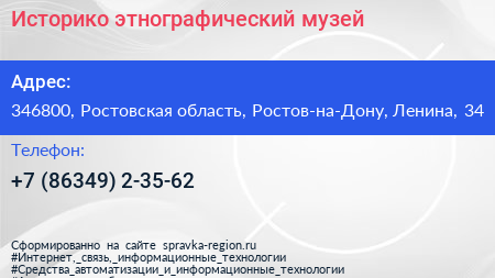 Историко-этнографический музей по адресу 346800, Ростовская область, Ростов-на-Дону, Ленина, 34 в дальнейшем Организация, размещена в следующих категориях: