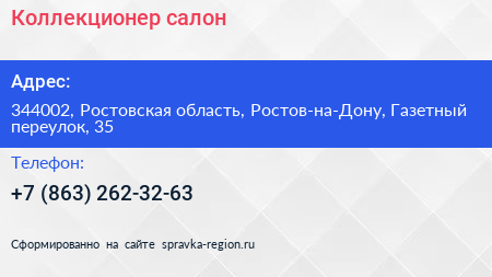 Коллекционер, салон по адресу 344002, Ростовская область, Ростов-на-Дону, Газетный переулок, 35 в дальнейшем Организация, размещена в следующих категориях: