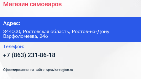 Магазин самоваров по адресу 344000, Ростовская область, Ростов-на-Дону, Варфоломеева, 246 в дальнейшем Организация, размещена в следующих категориях: