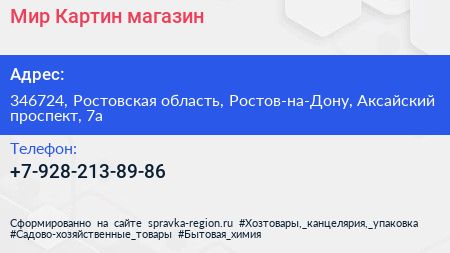 Мир Картин, магазин по адресу 346724, Ростовская область, Ростов-на-Дону, Аксайский проспект, 7а в дальнейшем Организация, размещена в следующих категориях: