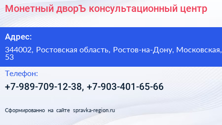 Монетный дворЪ, консультационный центр по адресу 344002, Ростовская область, Ростов-на-Дону, Московская, 53 в дальнейшем Организация, размещена в следующих категориях:
