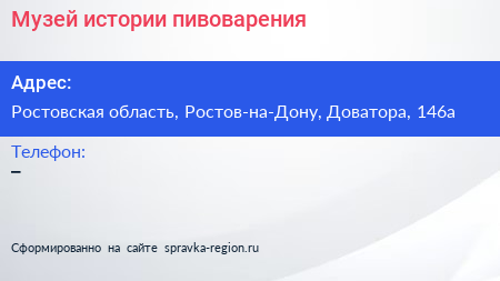 Музей истории пивоварения по адресу Ростовская область, Ростов-на-Дону, Доватора, 146а в дальнейшем Организация, размещена в следующих категориях:
