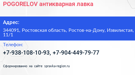 POGORELOV, антикварная лавка по адресу 344091, Ростовская область, Ростов-на-Дону, Извилистая, 11/1 в дальнейшем Организация, размещена в следующих категориях: