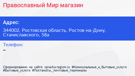 Православный Мир, магазин по адресу 344002, Ростовская область, Ростов-на-Дону, Станиславского, 58а в дальнейшем Организация, размещена в следующих категориях: