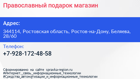 Православный подарок, магазин по адресу 344114, Ростовская область, Ростов-на-Дону, Беляева, 28/60 в дальнейшем Организация, размещена в следующих категориях: