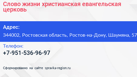 Слово жизни, христианская евангельская церковь по адресу 344002, Ростовская область, Ростов-на-Дону, Шаумяна, 57 в дальнейшем Организация, размещена в следующих категориях: