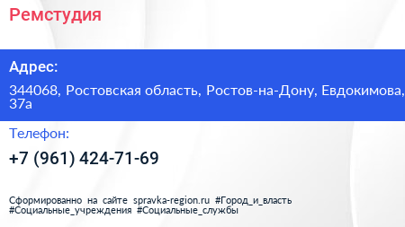 Ремстудия по адресу 344068, Ростовская область, Ростов-на-Дону, Евдокимова, 37а в дальнейшем Организация, размещена в следующих категориях: