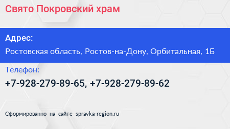 Свято-Покровский храм по адресу Ростовская область, Ростов-на-Дону, Орбитальная, 1Б в дальнейшем Организация, размещена в следующих категориях: