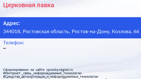 Церковная лавка по адресу 344018, Ростовская область, Ростов-на-Дону, Козлова, 66 в дальнейшем Организация, размещена в следующих категориях: