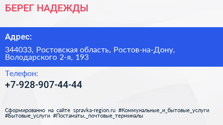 БЕРЕГ НАДЕЖДЫ по адресу 344033, Ростовская область, Ростов-на-Дону, Володарского 2-я, 193 в дальнейшем Организация, размещена в следующих категориях: