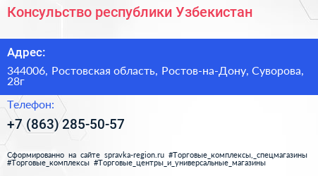 Консульство республики Узбекистан по адресу 344006, Ростовская область, Ростов-на-Дону, Суворова, 28г в дальнейшем Организация, размещена в следующих категориях: