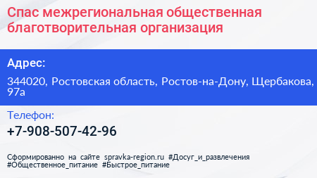 Спас, межрегиональная общественная благотворительная организация по адресу 344020, Ростовская область, Ростов-на-Дону, Щербакова, 97а в дальнейшем Организация, размещена в следующих категориях: