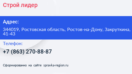 Строй лидер по адресу 344019, Ростовская область, Ростов-на-Дону, Закруткина, 41-43 в дальнейшем Организация, размещена в следующих категориях: