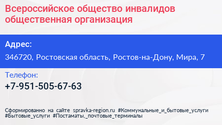Всероссийское общество инвалидов, общественная организация по адресу 346720, Ростовская область, Ростов-на-Дону, Мира, 7 в дальнейшем Организация, размещена в следующих категориях: