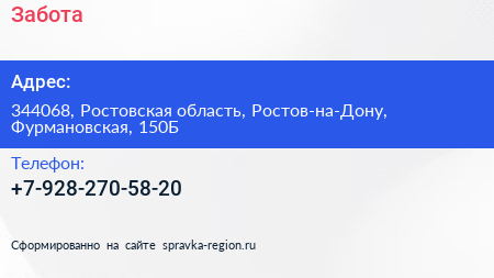 Забота по адресу 344068, Ростовская область, Ростов-на-Дону, Фурмановская, 150Б в дальнейшем Организация, размещена в следующих категориях: