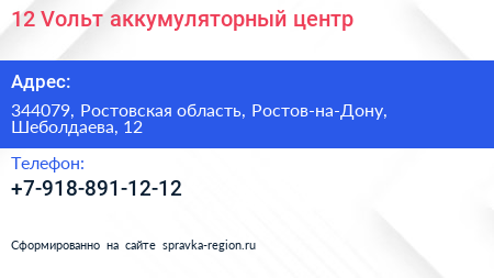 12 Vольт, аккумуляторный центр по адресу 344079, Ростовская область, Ростов-на-Дону, Шеболдаева, 12 в дальнейшем Организация, размещена в следующих категориях: