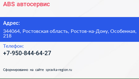 ABS, автосервис по адресу 344064, Ростовская область, Ростов-на-Дону, Особенная, 218 в дальнейшем Организация, размещена в следующих категориях: