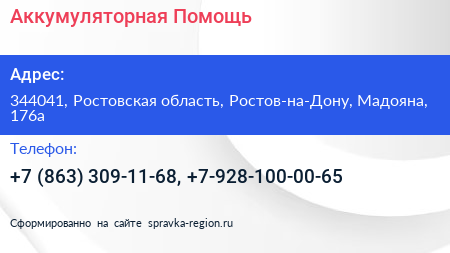 Аккумуляторная Помощь по адресу 344041, Ростовская область, Ростов-на-Дону, Мадояна, 176а в дальнейшем Организация, размещена в следующих категориях: