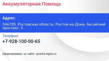 Аккумуляторная Помощь по адресу 346720, Ростовская область, Ростов-на-Дону, Аксайский проспект, 5 в дальнейшем Организация, размещена в следующих категориях:
