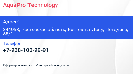 AquaPro Technology по адресу 344068, Ростовская область, Ростов-на-Дону, Погодина, 68/1 в дальнейшем Организация, размещена в следующих категориях: