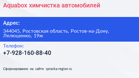 Aquabox, химчистка автомобилей по адресу 344045, Ростовская область, Ростов-на-Дону, Лелюшенко, 19ж в дальнейшем Организация, размещена в следующих категориях:
