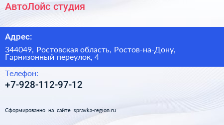 АвтоЛойс, студия по адресу 344049, Ростовская область, Ростов-на-Дону, Гарнизонный переулок, 4 в дальнейшем Организация, размещена в следующих категориях: