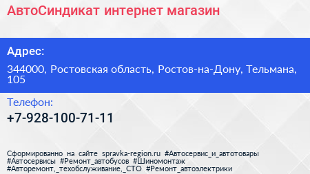 АвтоСиндикат, интернет-магазин по адресу 344000, Ростовская область, Ростов-на-Дону, Тельмана, 105 в дальнейшем Организация, размещена в следующих категориях: