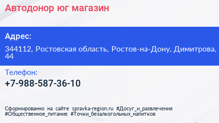 Автодонор-юг, магазин по адресу 344112, Ростовская область, Ростов-на-Дону, Димитрова, 44 в дальнейшем Организация, размещена в следующих категориях: