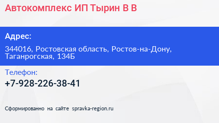 Автокомплекс, ИП Тырин В.В. по адресу 344016, Ростовская область, Ростов-на-Дону, Таганрогская, 134Б в дальнейшем Организация, размещена в следующих категориях: