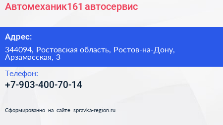 Автомеханик161, автосервис по адресу 344094, Ростовская область, Ростов-на-Дону, Арзамасская, 3 в дальнейшем Организация, размещена в следующих категориях:
