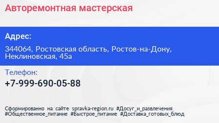 Авторемонтная мастерская по адресу 344064, Ростовская область, Ростов-на-Дону, Неклиновская, 45а в дальнейшем Организация, размещена в следующих категориях: