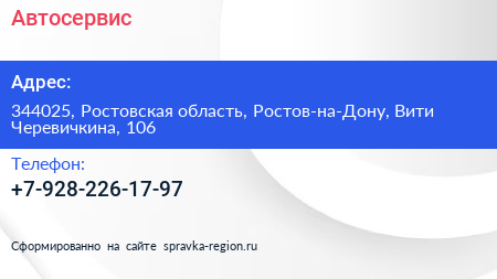 Автосервис по адресу 344025, Ростовская область, Ростов-на-Дону, Вити Черевичкина, 106 в дальнейшем Организация, размещена в следующих категориях: