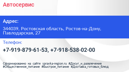Автосервис по адресу 344039, Ростовская область, Ростов-на-Дону, Павлодарская, 27 в дальнейшем Организация, размещена в следующих категориях: