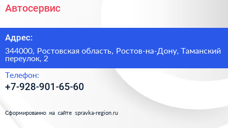 Автосервис по адресу 344000, Ростовская область, Ростов-на-Дону, Таманский переулок, 2 в дальнейшем Организация, размещена в следующих категориях: