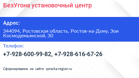 БезУгона, установочный центр по адресу 344094, Ростовская область, Ростов-на-Дону, Зои Космодемьянской, 30 в дальнейшем Организация, размещена в следующих категориях: