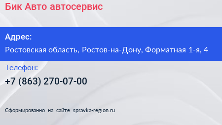 Бик-Авто, автосервис по адресу Ростовская область, Ростов-на-Дону, Форматная 1-я, 4 в дальнейшем Организация, размещена в следующих категориях: