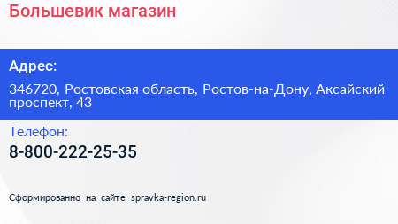 Большевик, магазин по адресу 346720, Ростовская область, Ростов-на-Дону, Аксайский проспект, 43 в дальнейшем Организация, размещена в следующих категориях: