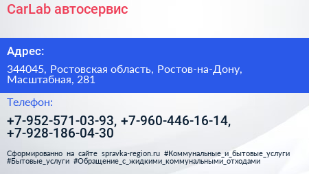 CarLab, автосервис по адресу 344045, Ростовская область, Ростов-на-Дону, Масштабная, 281 в дальнейшем Организация, размещена в следующих категориях: