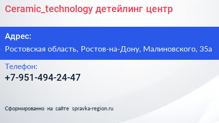 Ceramic_technology, детейлинг-центр по адресу Ростовская область, Ростов-на-Дону, Малиновского, 35а в дальнейшем Организация, размещена в следующих категориях: