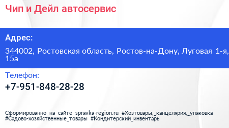 Чип и Дейл, автосервис по адресу 344002, Ростовская область, Ростов-на-Дону, Луговая 1-я, 15а в дальнейшем Организация, размещена в следующих категориях: