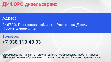 ДИФОРС, дизельсервис по адресу 346720, Ростовская область, Ростов-на-Дону, Промышленная, 2 в дальнейшем Организация, размещена в следующих категориях: