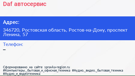 Daf, автосервис по адресу 346720, Ростовская область, Ростов-на-Дону, проспект Ленина, 57 в дальнейшем Организация, размещена в следующих категориях: