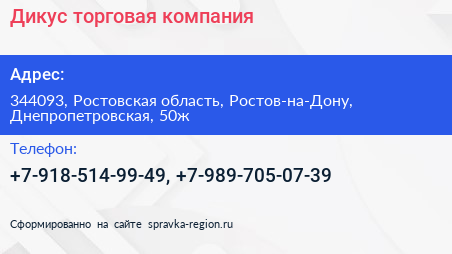 Дикус, торговая компания по адресу 344093, Ростовская область, Ростов-на-Дону, Днепропетровская, 50ж в дальнейшем Организация, размещена в следующих категориях:
