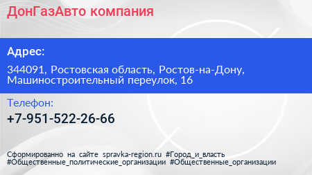ДонГазАвто, компания по адресу 344091, Ростовская область, Ростов-на-Дону, Машиностроительный переулок, 16 в дальнейшем Организация, размещена в следующих категориях: