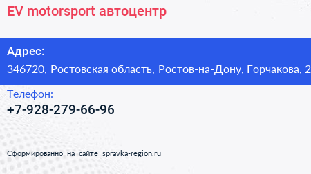 EV-motorsport, автоцентр по адресу 346720, Ростовская область, Ростов-на-Дону, Горчакова, 2 в дальнейшем Организация, размещена в следующих категориях: