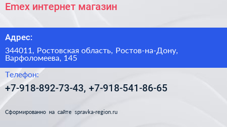 Emex, интернет-магазин по адресу 344011, Ростовская область, Ростов-на-Дону, Варфоломеева, 145 в дальнейшем Организация, размещена в следующих категориях: