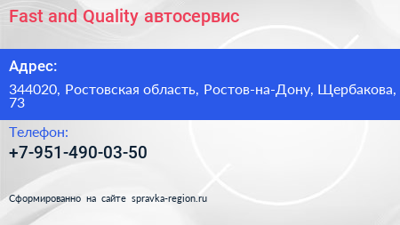 Fast and Quality, автосервис по адресу 344020, Ростовская область, Ростов-на-Дону, Щербакова, 73 в дальнейшем Организация, размещена в следующих категориях: