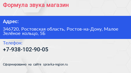 Формула звука, магазин по адресу 346720, Ростовская область, Ростов-на-Дону, Малое Зелёное кольцо, 5Б в дальнейшем Организация, размещена в следующих категориях: