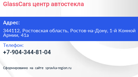 GlassCars, центр автостекла по адресу 344112, Ростовская область, Ростов-на-Дону, 1-й Конной Армии, 41а в дальнейшем Организация, размещена в следующих категориях: